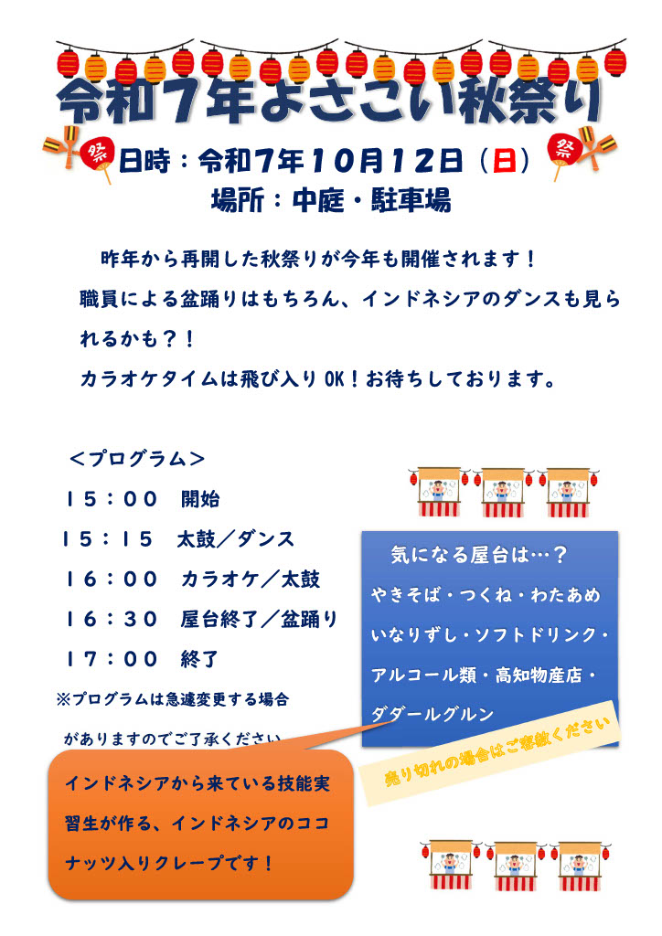 昨年から暑い夏を避け、秋にお祭りを開催しております。
